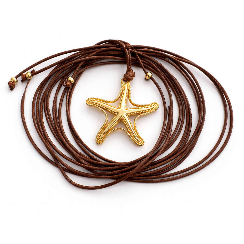 Featuring a gold-tone metal starfish pendant inspired by desert symbols and western heritage, paired with a rustic brown cord and handcrafted knots, it embodies strength, freedom, and natural beauty.